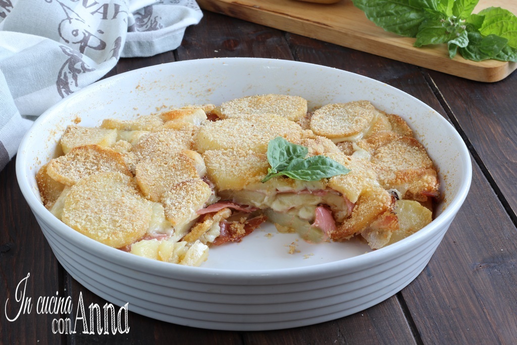 Coloca una capa de patatas, cubre las patatas con una capa de bechamel, una ligera espolvoreada de queso rallado y el jamón cocido.