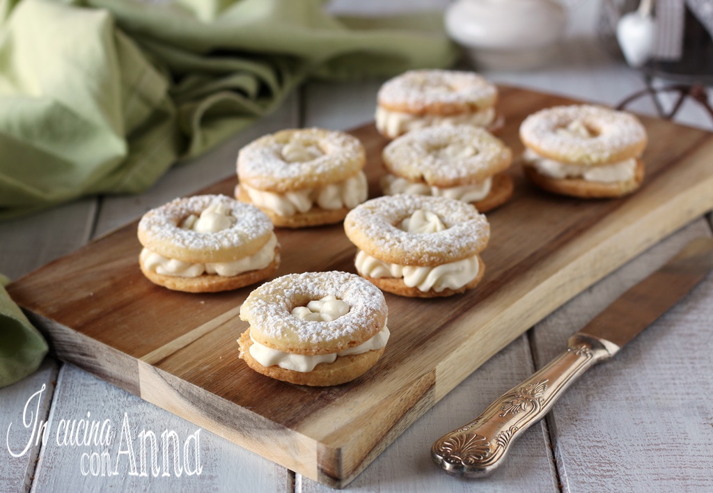 • Pon la crema de café en una manga pastelera con boquilla de estrella y rellena el lado de la galleta sin agujero, cierra la galleta colocando sobre el relleno la otra galleta con agujero, coloca los pastelitos a medida que los rellenas en una bandeja.