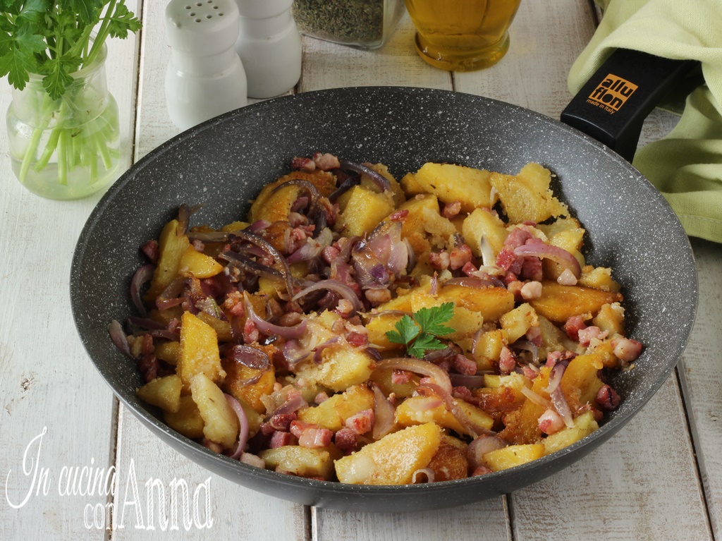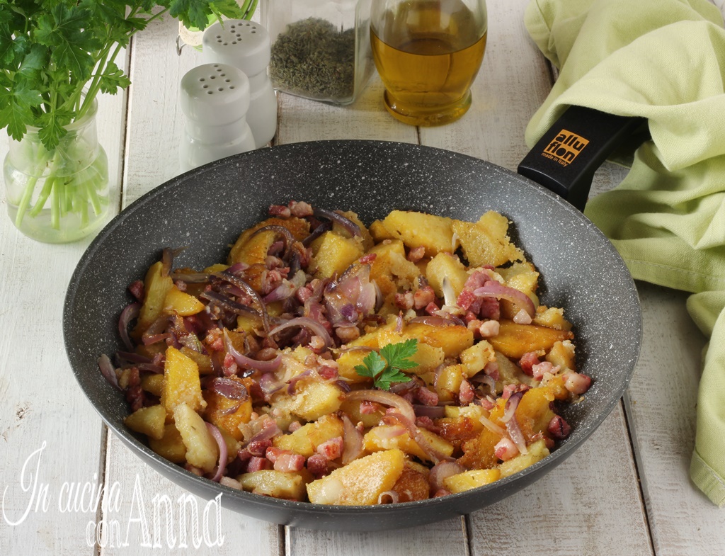 Las patatas a la campesina son excelentes como acompañamiento para segundos platos de carne, embutidos, mozzarella o quesos, pero añadiendo un par de patatas más son perfectas también como plato único para una cena sabrosa y deliciosa 🙂