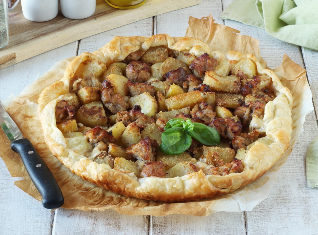 La Tarta rústica con patatas y salchicha es un plato muy simple de preparar, apetitosa y muy sabrosa, tiene una base de hojaldre rellena con patatas y salchicha doradas en la sartén y mucha scamorza derretida, el relleno durante la cocción permanece suave en el interior y gracias al pan rallado se obtiene una corteza deliciosa, un rústico perfecto como aperitivo o como plato único para cenar; esta tarta salada es buenísima también fría por lo que puedes servirla en un buffet para tus fiestas o llevarla a la playa o de picnic, dentro de poco se acerca la Pascua y para el Lunes de Pascua es perfecta 🙂