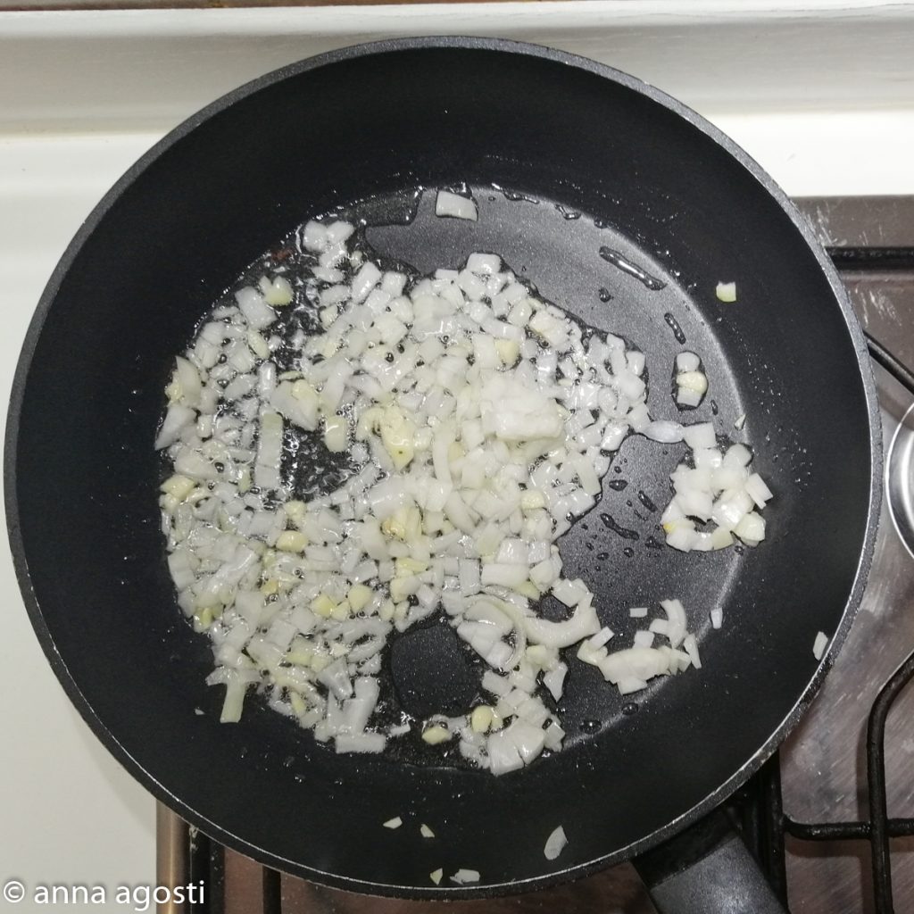 • Pica finamente la cebolla junto con los dientes de ajo y sofríe en una sartén con poco aceite de oliva virgen extra.