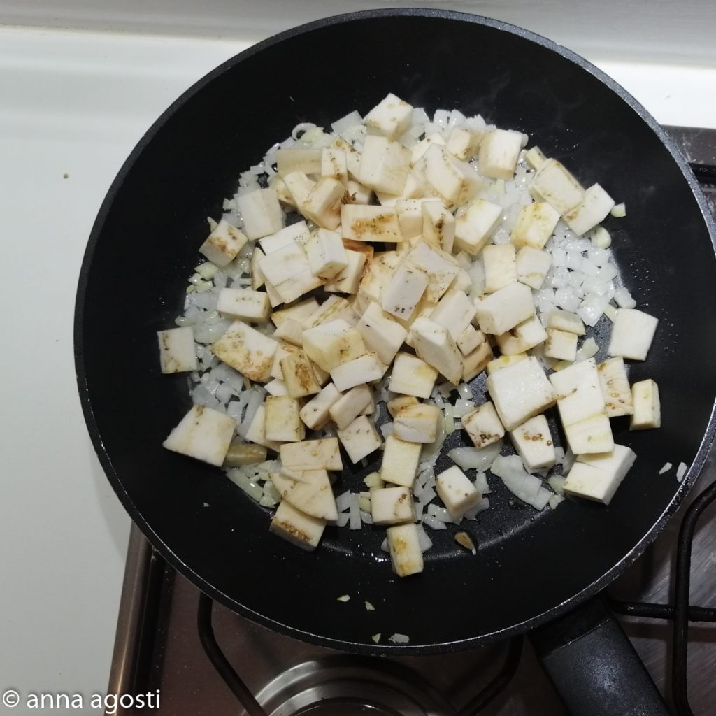 • Una vez que las cebollas se vuelvan transparentes, agrega los cubitos de berenjena.