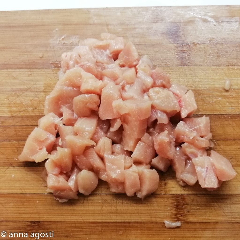 • Corta la pechuga de pollo en trozos pequeños como las berenjenas.
