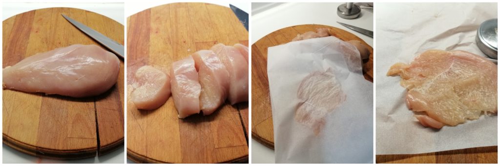 Primero, corta la pechuga de pollo en rebanadas gruesas que luego aplanarás con el mazo de carne para obtener chuletas tan delgadas como quieras o más gruesas si prefieres.