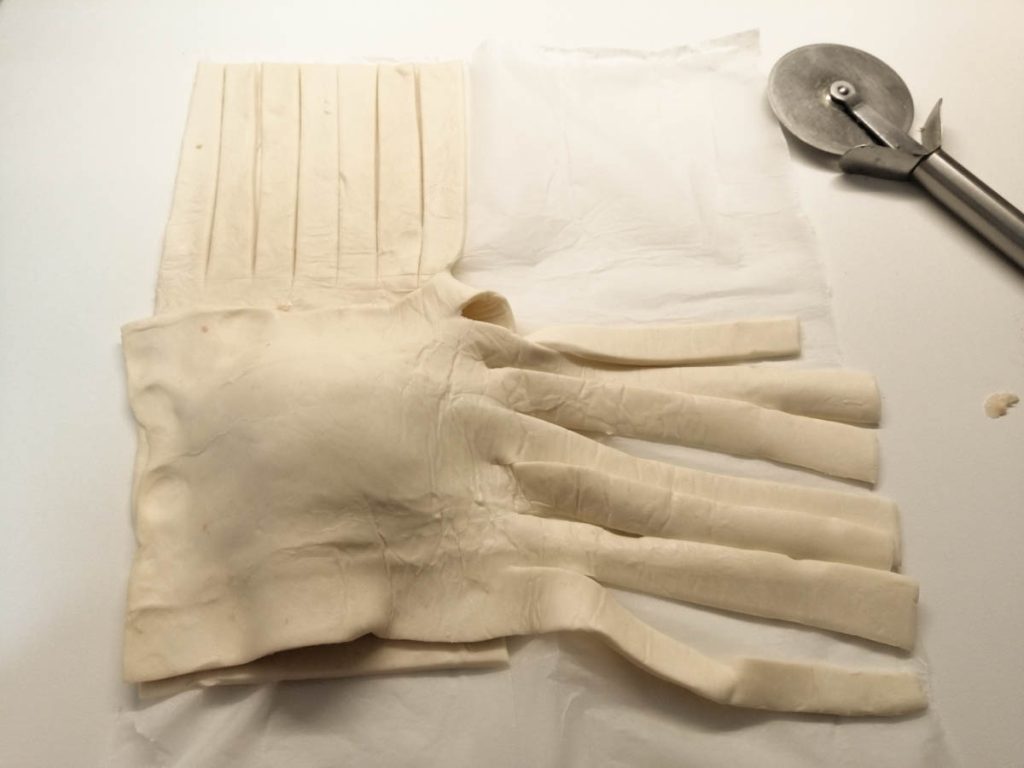• Una vez terminado de trenzar todas las tiras, pincelar con un poquito de huevo o leche y colocar los paquetitos de hojaldre rellenos sobre papel de horno dentro de una bandeja para horno.