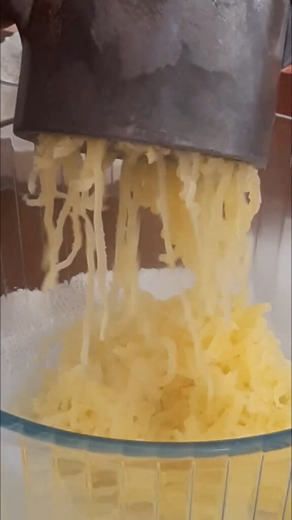 Pasa las patatas por la prensa patatas (veréis que la piel se queda pegada dentro).