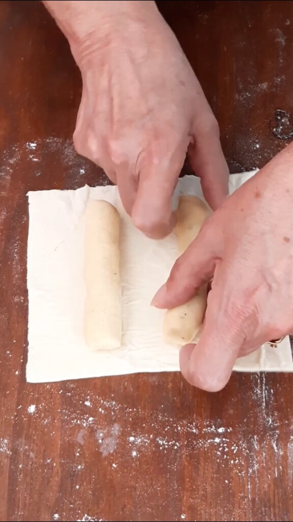 Desenrollad el hojaldre y sacad rectángulos de 8 cm, luego insertad 2 cilindros de patatas y enrollad hacia el centro.
