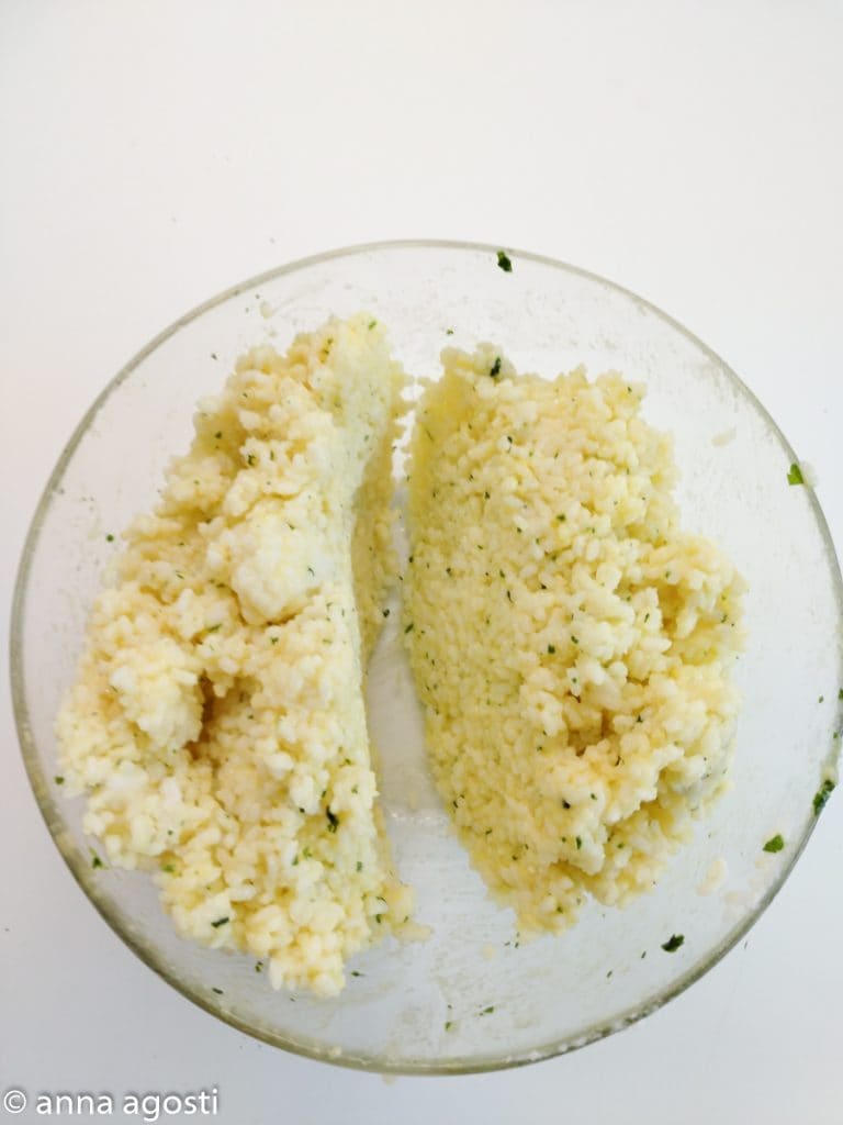 2- Agregue los huevos, el perejil fresco picado y sazone con ajo en polvo y un pellizco de sal.