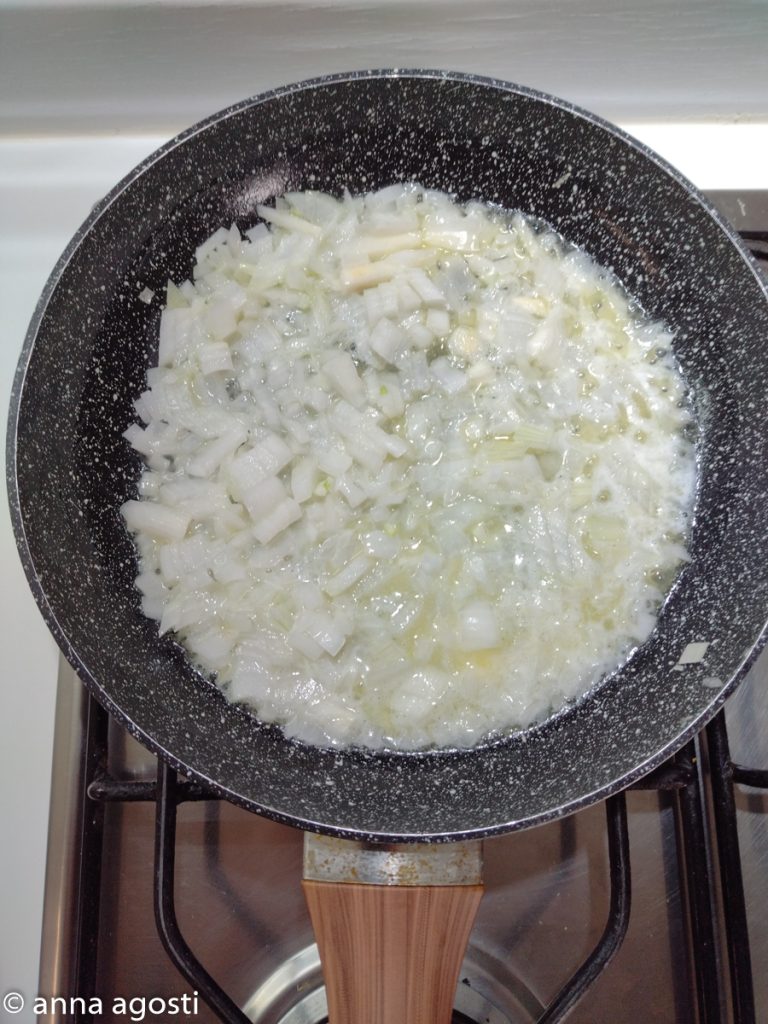 5- Pique finamente la cebolla y sofríala en la sartén hasta que se vuelva casi transparente.