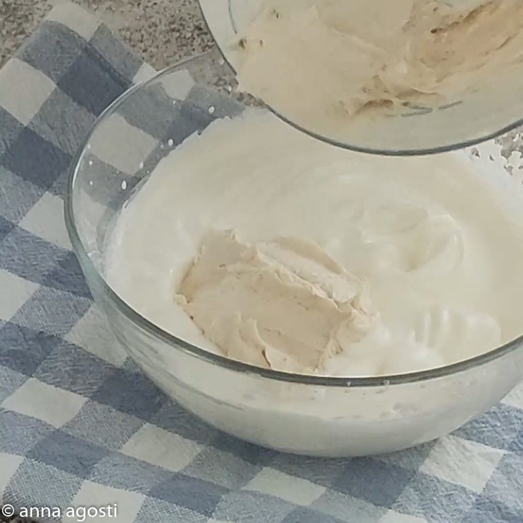 Une el mascarpone a la nata montada ayudándote con una cuchara, incorpora bien.