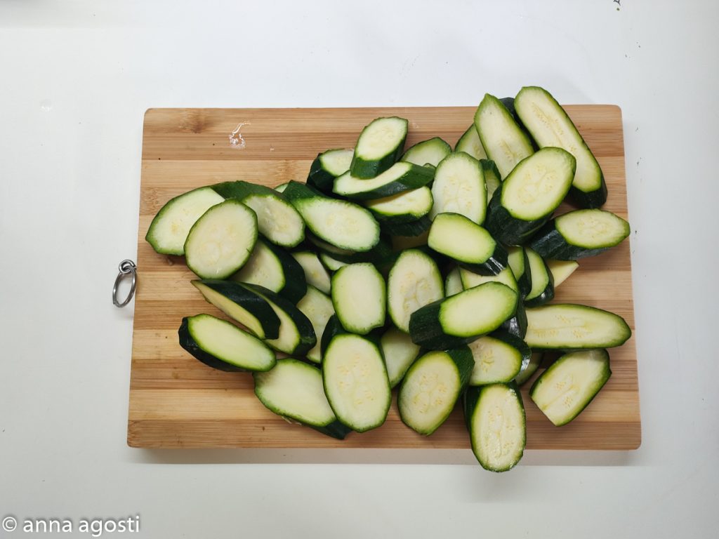 Lavar, cortar los extremos y cortar en rombos los calabacines.