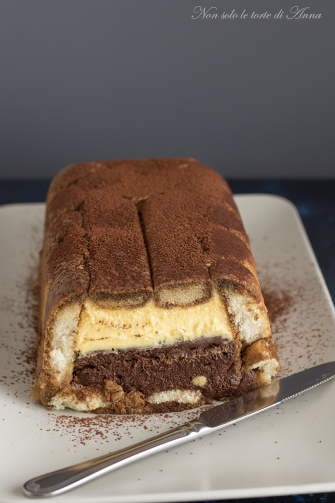 Al momento de servir, dad la vuelta al molde sobre un plato de servir, retirad el film y espolvoread generosamente con el cacao amargo.Un pequeño consejo: Si queréis una rebanada perfecta como la de la foto, aseguraos de compactar bien las capas de crema mientras las vertéis en el molde!