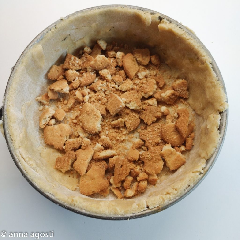 Tritad gruesamente las galletas secas y distribuid la mitad sobre la base de la tarta de ricotta con frutas confitadas.