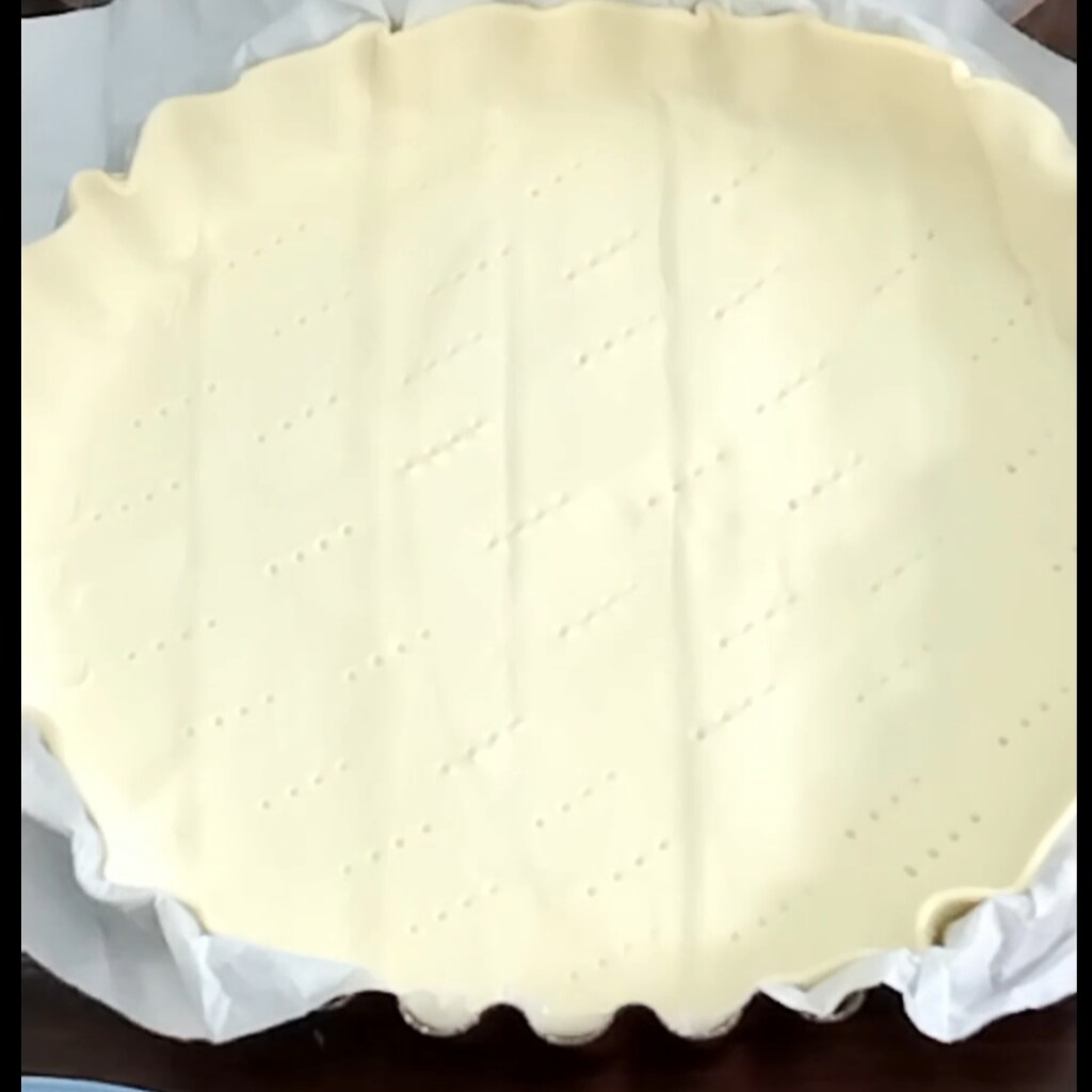 Desenrolla un rollo de hojaldre y con su papel de horno colócalo dentro de un molde para tartas.
