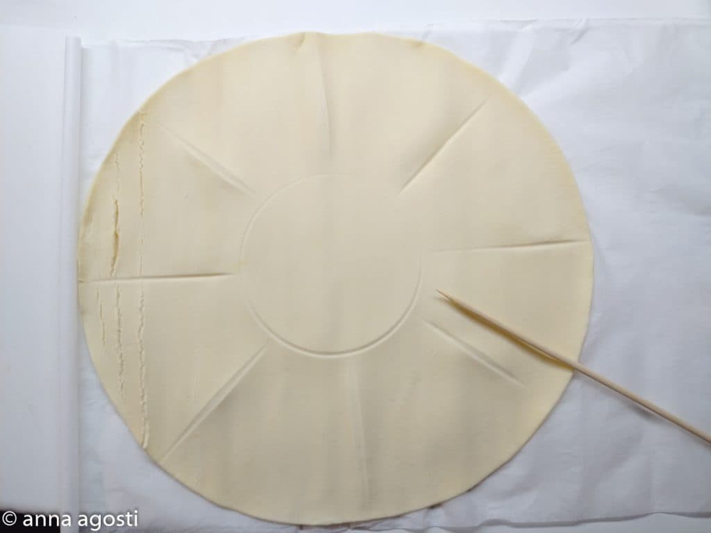 Con una taza o un vaso marca el centro y con un palillo de madera marca sin perforar el hojaldre dividiéndolo en 8 partes.