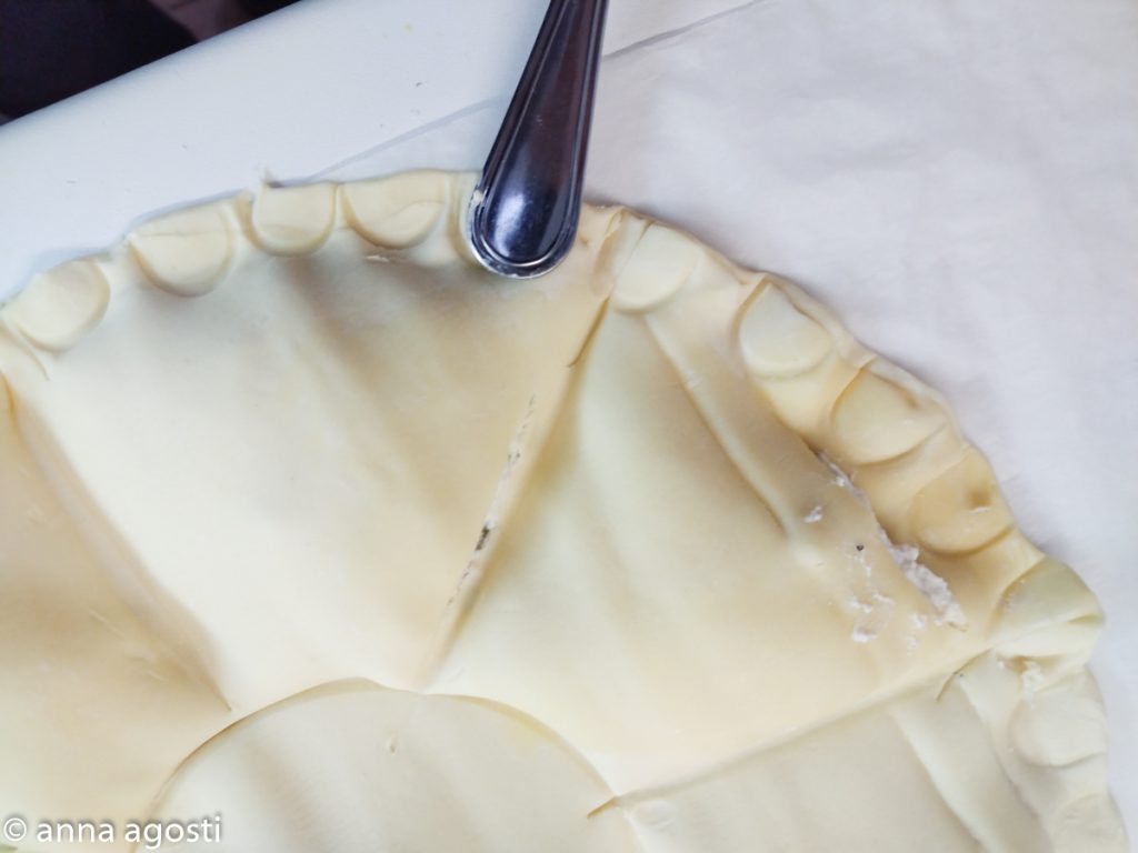 Sella bien los bordes con el dorso de un tenedor haciendo marcas que impedirán que el relleno salga durante la cocción.