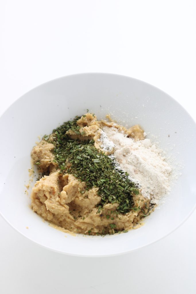 Limpiad y picad el romero y las hojas de salvia, unidlas al puré de garbanzos junto con la harina y la sal. Mezclad la masa de manera que todos los ingredientes estén bien incorporados.