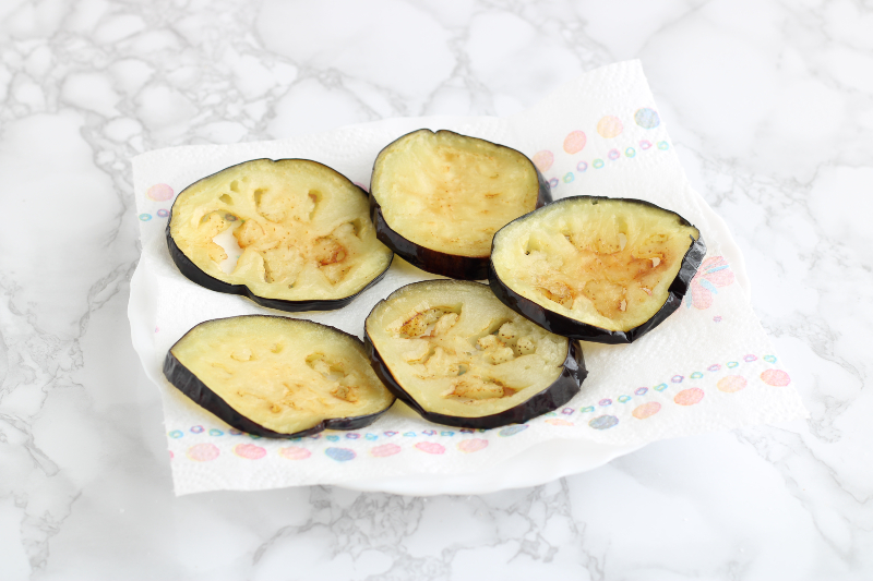 Lava las berenjenas y córtalas en rodajas de aproximadamente medio centímetro con un cuchillo de hoja lisa, luego colócalas en capas en un escurridor colocado sobre un plato hondo y espolvorea con sal gruesa entre una capa y otra. Coloca un peso encima para que haga presión y déjalas escurrir durante unos treinta minutos. Pasado el tiempo o de todos modos cuando las berenjenas hayan perdido el líquido de vegetación, enjuágalas rápidamente para quitar la sal gruesa y sécalas con papel absorbente de cocina para secarlas.
