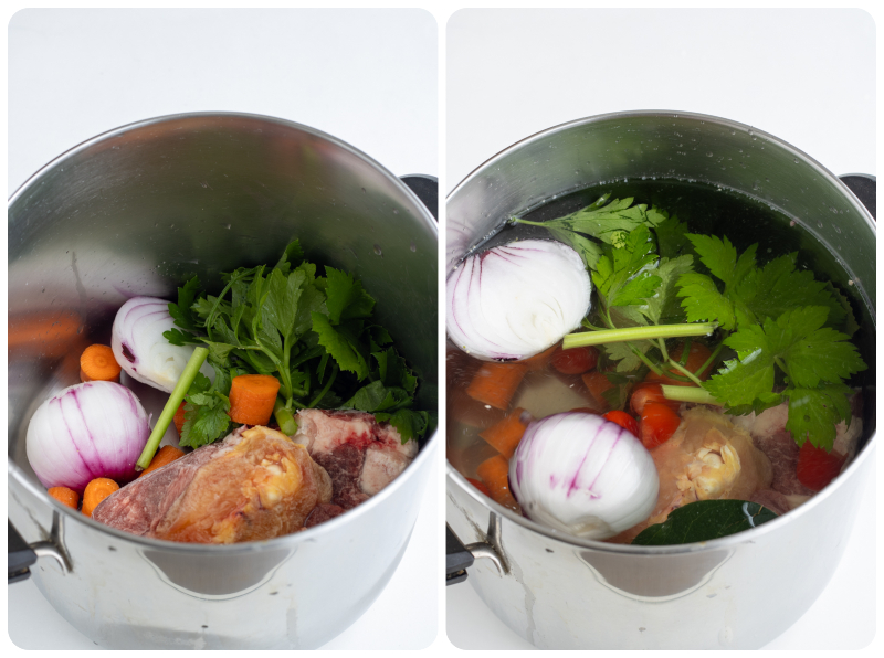 Lleva todo lentamente a ebullición. Espuma repetidamente con una espumadera para eliminar impurezas y obtener un caldo claro. Añade la pimienta en granos y las hojas de laurel, luego baja el fuego y deja hervir a fuego lento durante 2-3 horas. Ajusta de sal a mitad de cocción.
