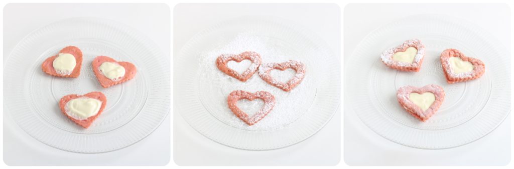 Rellena los corazones enteros con mermelada de frambuesa o grosellas rojas, espolvorea separadamente con azúcar glas los corazones perforados que luego colocarás sobre los otros, creando así tu galleta.