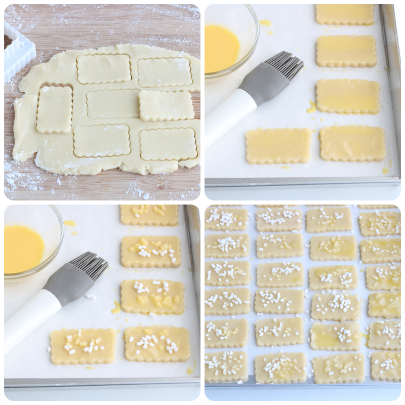 Pincelad las galletas con una yema de huevo batida junto con un poco de agua, luego espolvoread con granillo de azúcar.