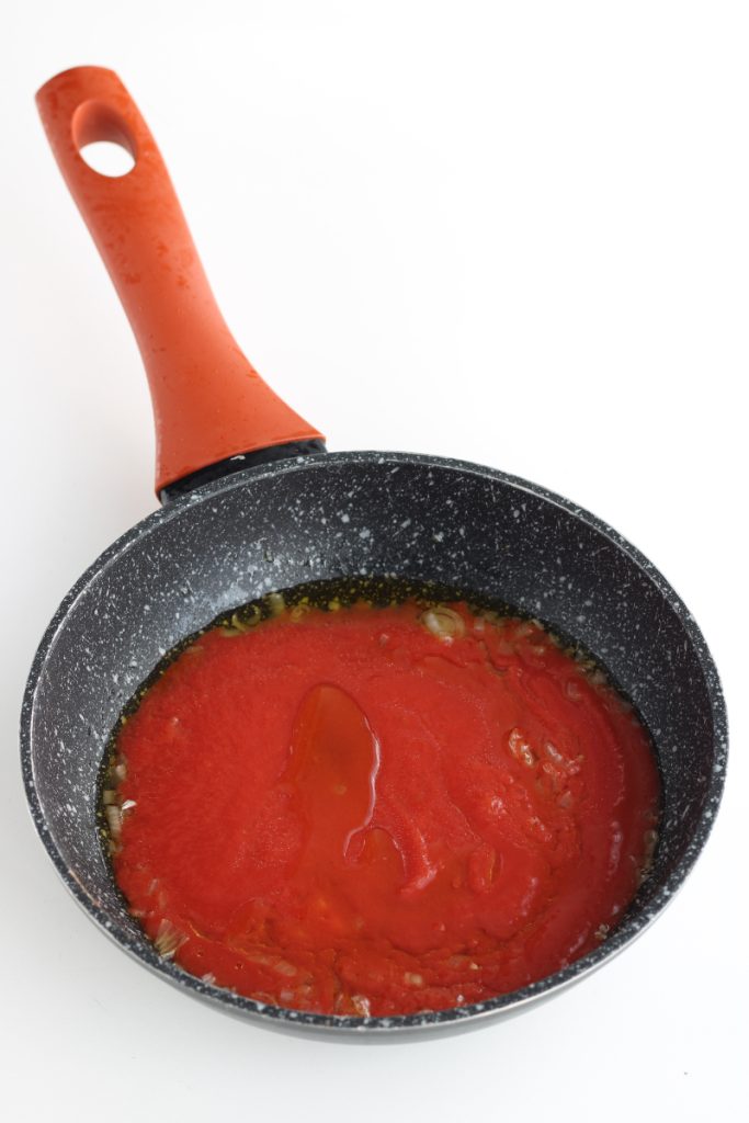 • Añade el puré de tomate junto con un vaso de agua, sala y pimienta, después cubre con una tapa y deja cocinar a fuego lento durante unos 15 minutos.