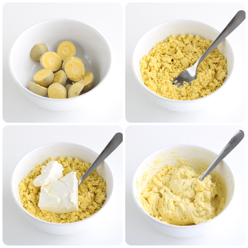 Ahora utiliza estas mezclas para rellenar los huevos (obtendrás 4 mitades de huevo para cada mezcla).