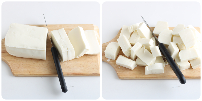 • Ahora pasa cada pieza de mozzarella primero por la harina, asegurándote de que esté bien cubierta.