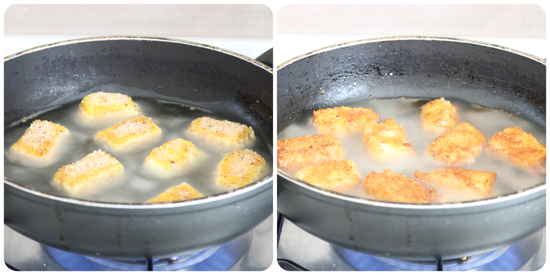 Calienta abundante aceite de semilla en una sartén con bordes altos. Cuando el aceite esté bien caliente, fríe pocos trozos a la vez, girándolos delicadamente a la mitad de la cocción, hasta que estén dorados por todos los lados.