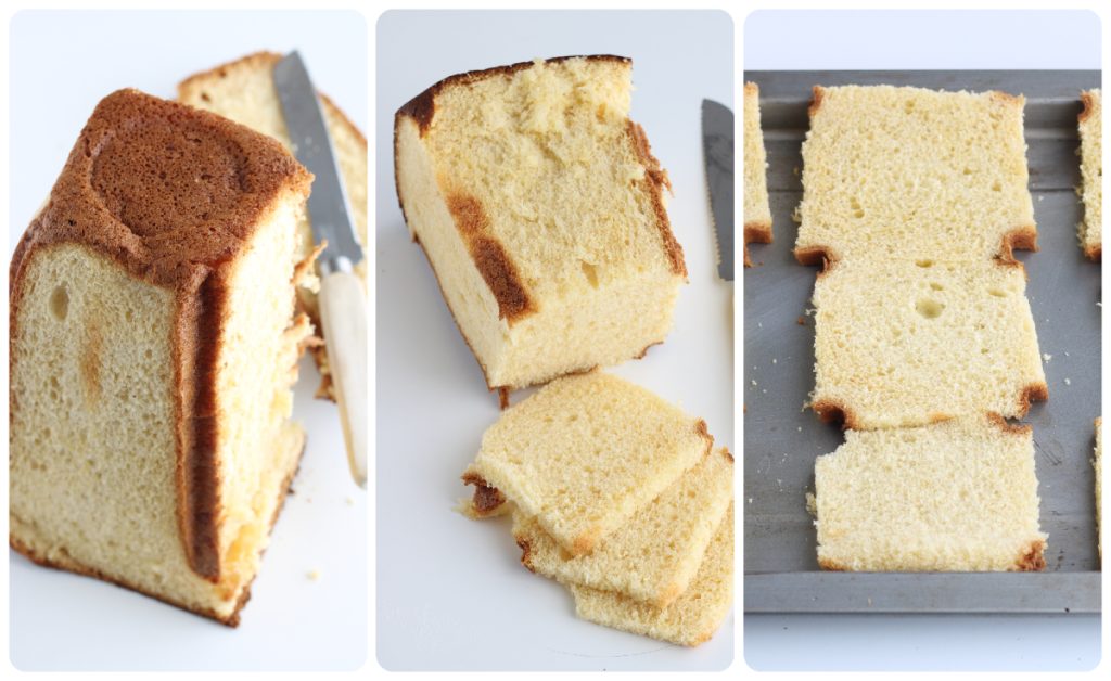 Con un cuchillo, quita la corteza del pandoro, forma un paralelepípedo y córtalo en rebanadas no muy gruesas en sentido horizontal. Colócalas en una bandeja de horno y tuéstalas en el horno a 160º.
