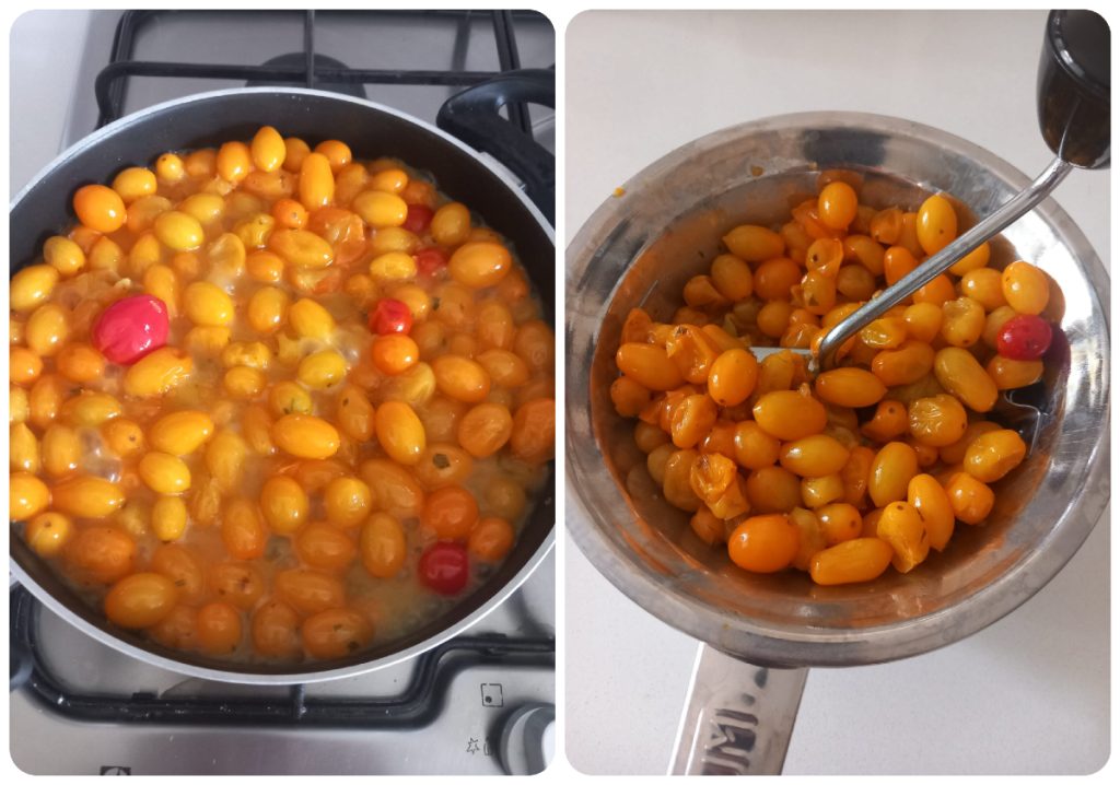 Por supuesto, podéis usar el mismo procedimiento también con tomatitos rojos, naturalmente el sabor de la salsa variará un poco.
