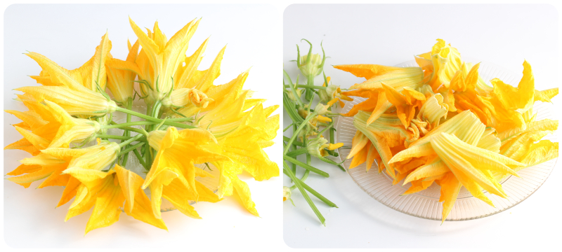 Limpiad las flores de calabacín eliminando el pistilo interno y el tallo, luego enjuagadlas delicadamente con agua fría y secadlas con papel absorbente de cocina.