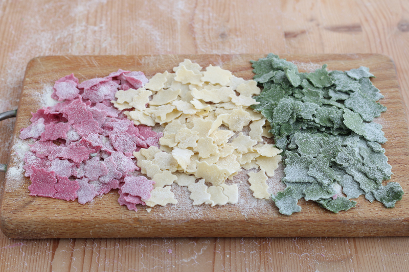 Para la preparación de la masa coloreada, refiérete a la receta de mis raviolis coloreados rellenos siguiendo los pasos desde la «preparación del color natural» hasta el «reposo de la masa».