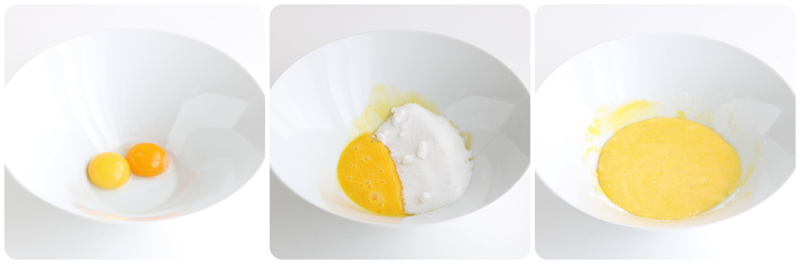 Separad las claras de las yemas, las primeras las usaréis para otra receta, mientras que las segundas las ponéis en un bol y las batís. Añadid el azúcar y continuad batiendo hasta obtener una crema homogénea.