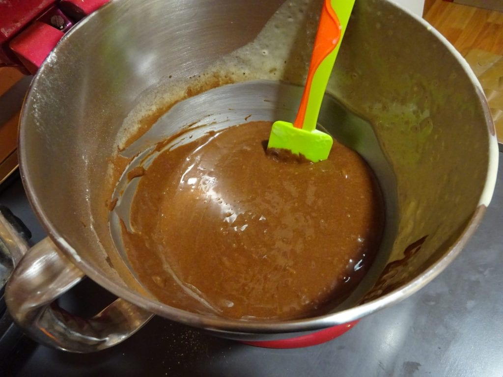A la otra mitad de la mezcla añada el cacao y la leche a temperatura ambiente. Mezcle bien hasta que la mezcla sea completamente marrón.