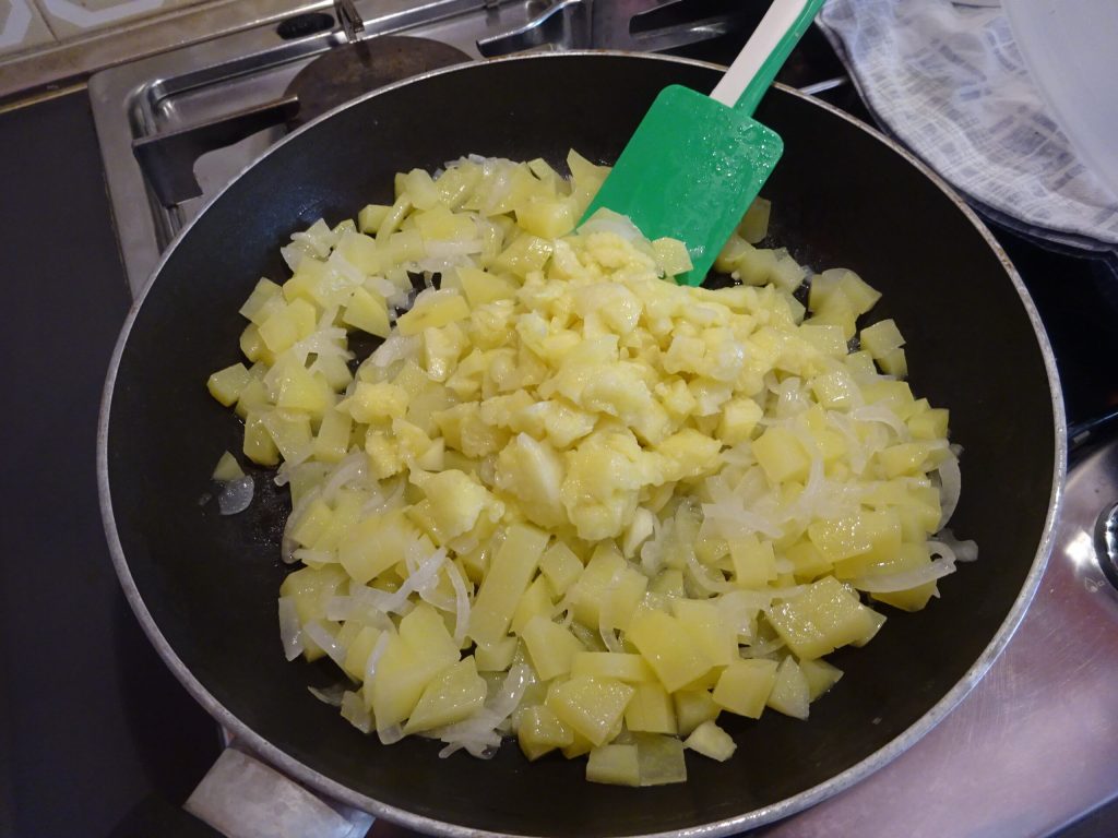 Después de 10 minutos de cocción de la cebolla, añade las patatas en cubos y cocina durante 5 minutos siempre a fuego medio-bajo.