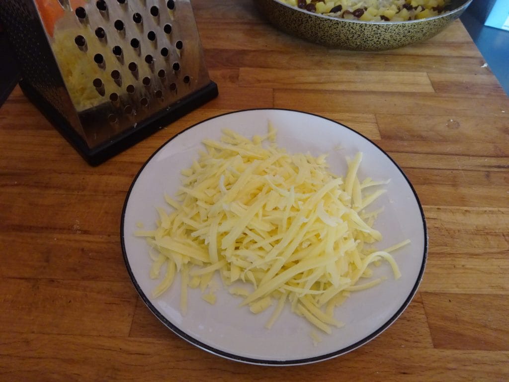 Ralla el queso Emmental bávaro con un rallador de agujeros grandes y añade a las patatas, cebollas y pulpa de calabacines.