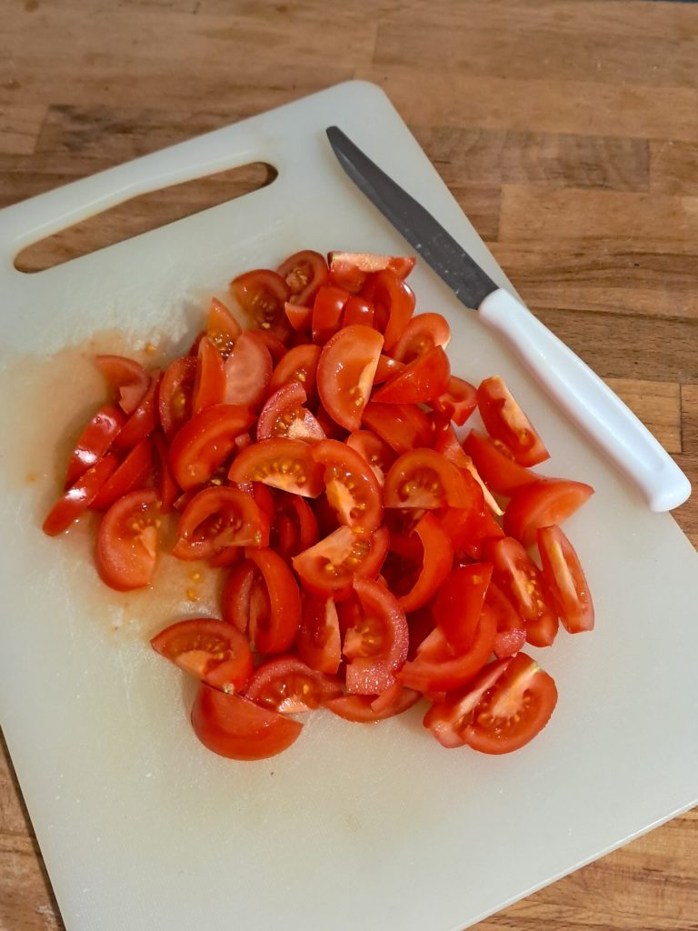 Lava y seca bien los tomatitos cherry, luego si son bastante grandes, córtalos en cuartos, de lo contrario córtalos solo a la mitad.