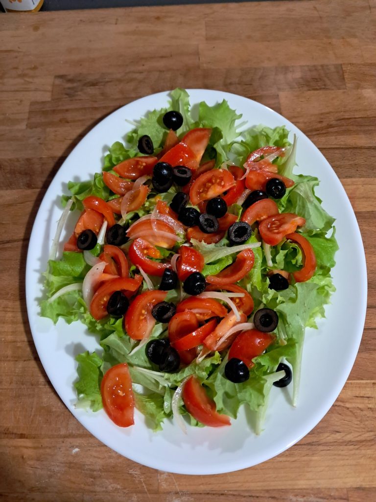 Toma los platos en los que quieras servir la ensalada, haz una base de lechuga y añade luego los tomates con la cebolla.