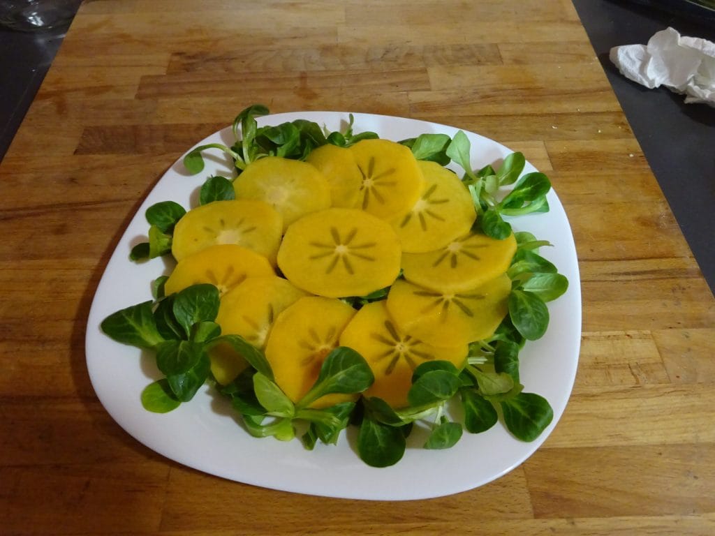 Coloca ahora la ensalada de canónigos en los platos y luego añade las rodajas de kaki persimón.