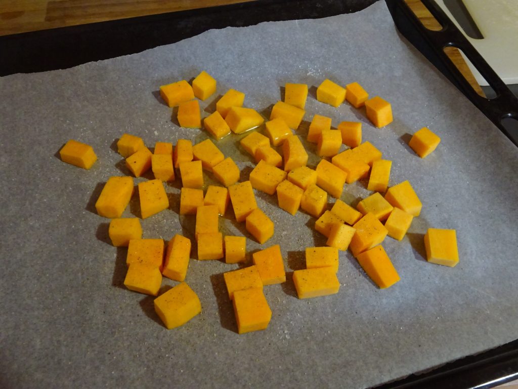 Corta la calabaza en cubos de aproximadamente 1 centímetro por lado y colócala en una bandeja revestida con papel de horno.