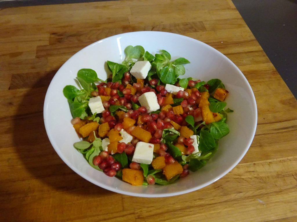 Y voilà… ahora tu ensalada de calabaza y granada está lista para ser servida.