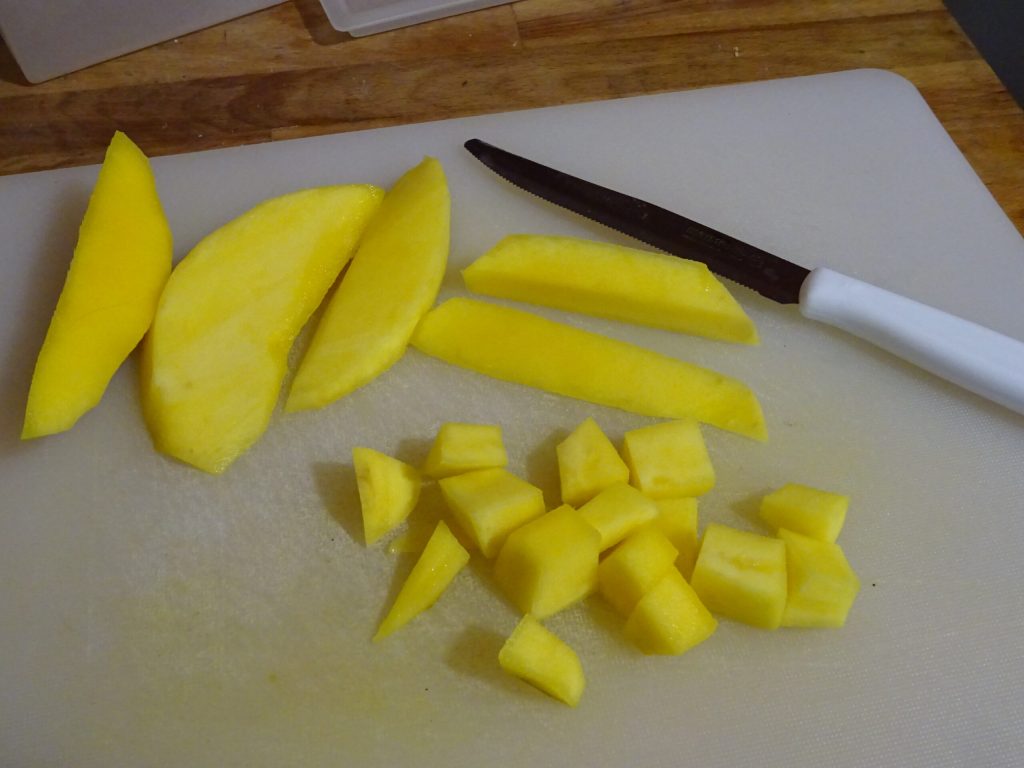 Pela el mango y córtalo en cubos de aproximadamente un centímetro de lado.