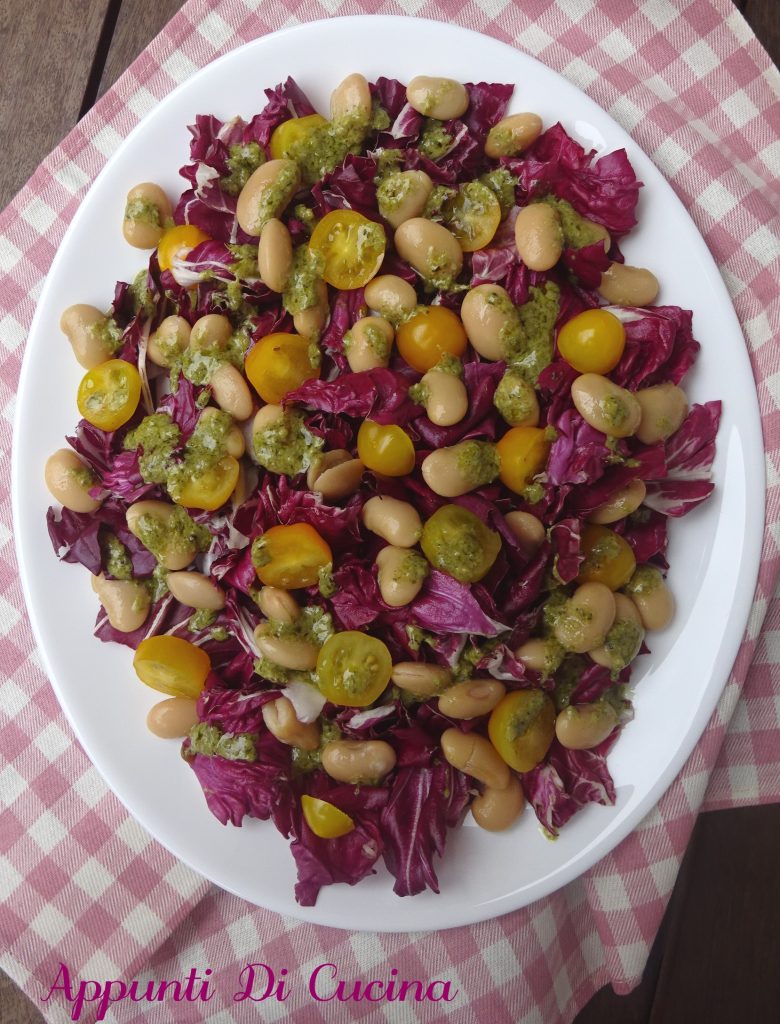 Ensalada de radicchio y judías de España, una ensalada rica en sabor gracias también al aliño a base de pesto genovese y un chorrito de vinagre de manzana. Es un segundo plato rico y completo que también se puede servir como guarnición. Receta de fácil ejecución y sin cocción, en 10 minutos habrás montado el almuerzo o la cena y es perfecto también para la llegada de invitados de última hora. Con esta receta podrás satisfacer a todos tus comensales, incluso a aquellos que siguen una dieta vegetariana o vegana. Si te gustan las ensaladas mixtas y quizás un poco peculiares