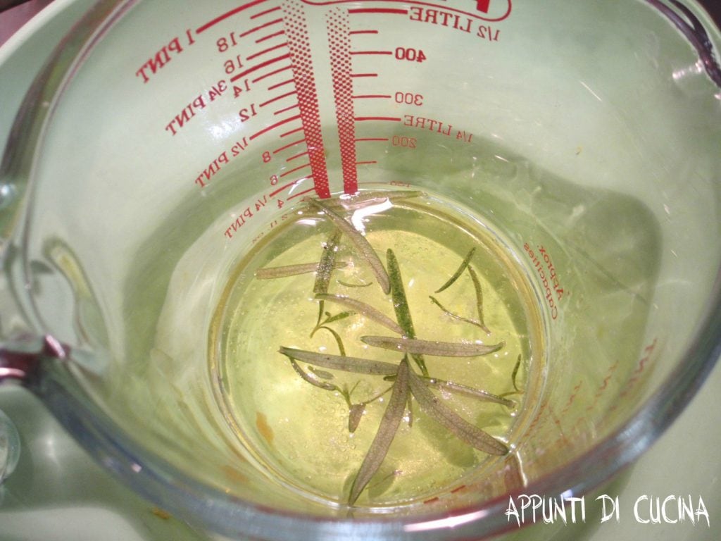 Mientras tanto, prepara la salmuera vertiendo en un recipiente agua, aceite y sal. Mezcla y añade una ramita de romero.