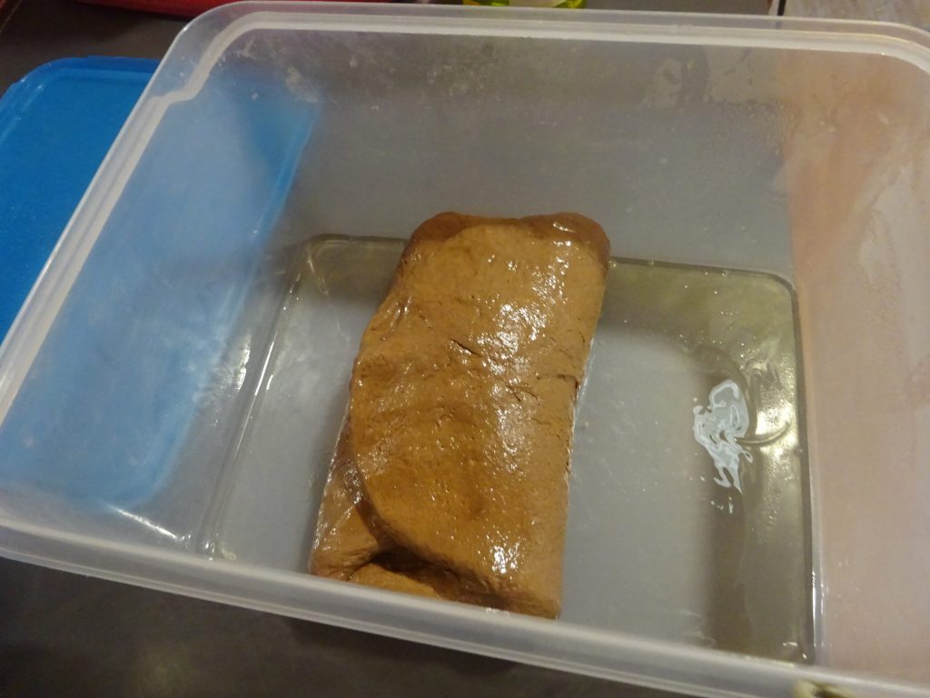• Cuando la masa esté lista, sacadla de la amasadora, formad una bola y ponedla a fermentar en un recipiente con tapa previamente engrasado. Dejad fermentar a temperatura ambiente durante 3 horas.