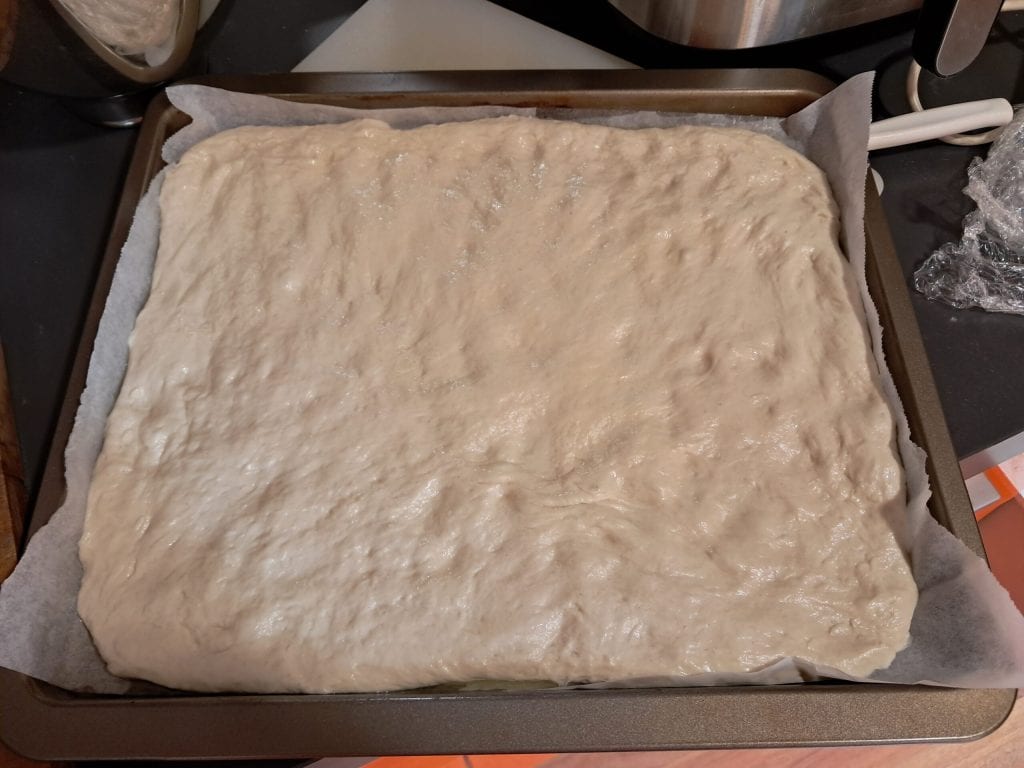 Con la bandeja 30×30 sale una focaccia ligeramente alta, si la quieres más fina usa una bandeja 35×35 o 40×40. Recuerda comprobar, sin embargo, la cocción, porque necesitarás 1 o 2 minutos menos.