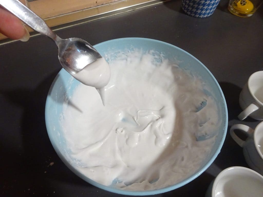 El glaseado estará listo cuando al levantarlo con la cuchara haga «picos» pero no gotee. Si resulta demasiado líquido añade poco a poco más azúcar glas.