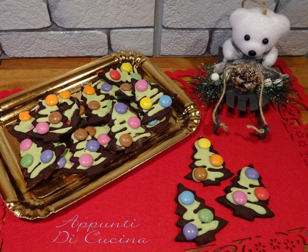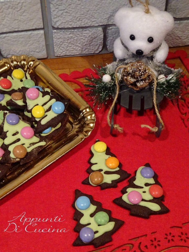 Galletas navideñas con masa quebrada al aceite, preparadas con una masa quebrada de cacao al aceite, glaseadas y decoradas con pequeños confites de chocolate de colores. También pueden ser un regalo «culinario» o pequeños marcadores de lugar para vuestras mesas de fiesta.