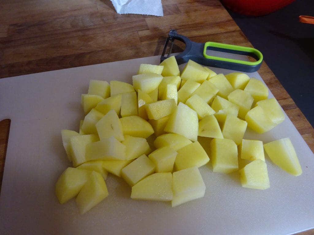 Mientras tanto, pelad y cortad las patatas en trozos de aproximadamente 2 centímetros.
